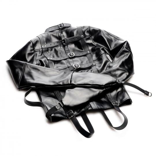 Completely restrain your sub to have your way with them! This unisex straight jacket allows you to trap your plaything with classic medical play fetish wear. Just slip your partners arms into the heavy-duty, leather-like sleeves and tighten the 5 secure buckles up the back. The dual crotch straps provide a tighter fit on both male and female bodies. Cross their arms in front of them and buckle the arm straps together behind them. A final strap wraps around their arms in the front and through loops in the jacket, providing a locking buckle that will keep your submissive completely immobilized until you are done playing with them. An O-ring on the collar allows you to attach a leash or other BDSM accessories. Restrict your sub and make them obey your every bidding!